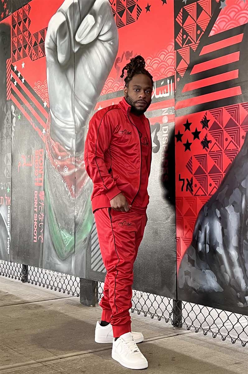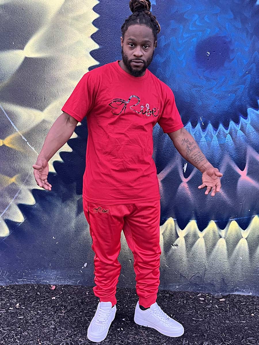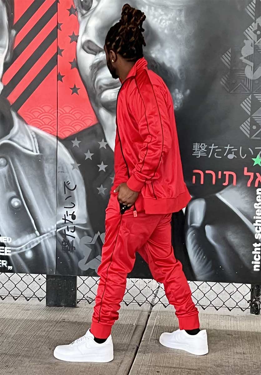 Men’s Dripping Red tracksuit, black piping w/ custom rubber logo. Is a must-have. Sewed with 100 % red Polyester trinda. This dripping red jealousy. Eye-catching tracksuit. Is outstanding in high-quality fabric, with a smooth rich texture. You will feel rich in authenticity. Designed to make you feel good while looking good.